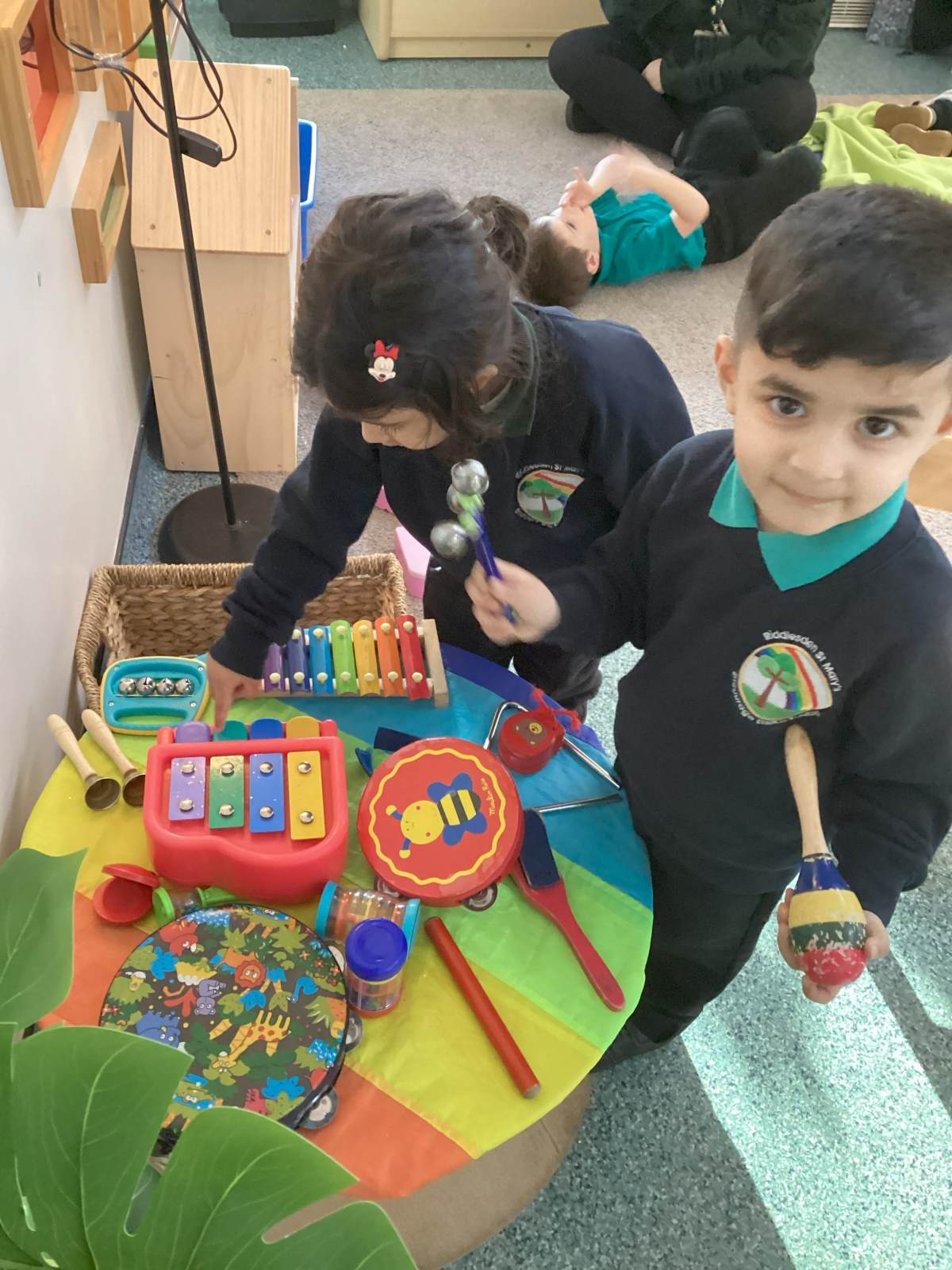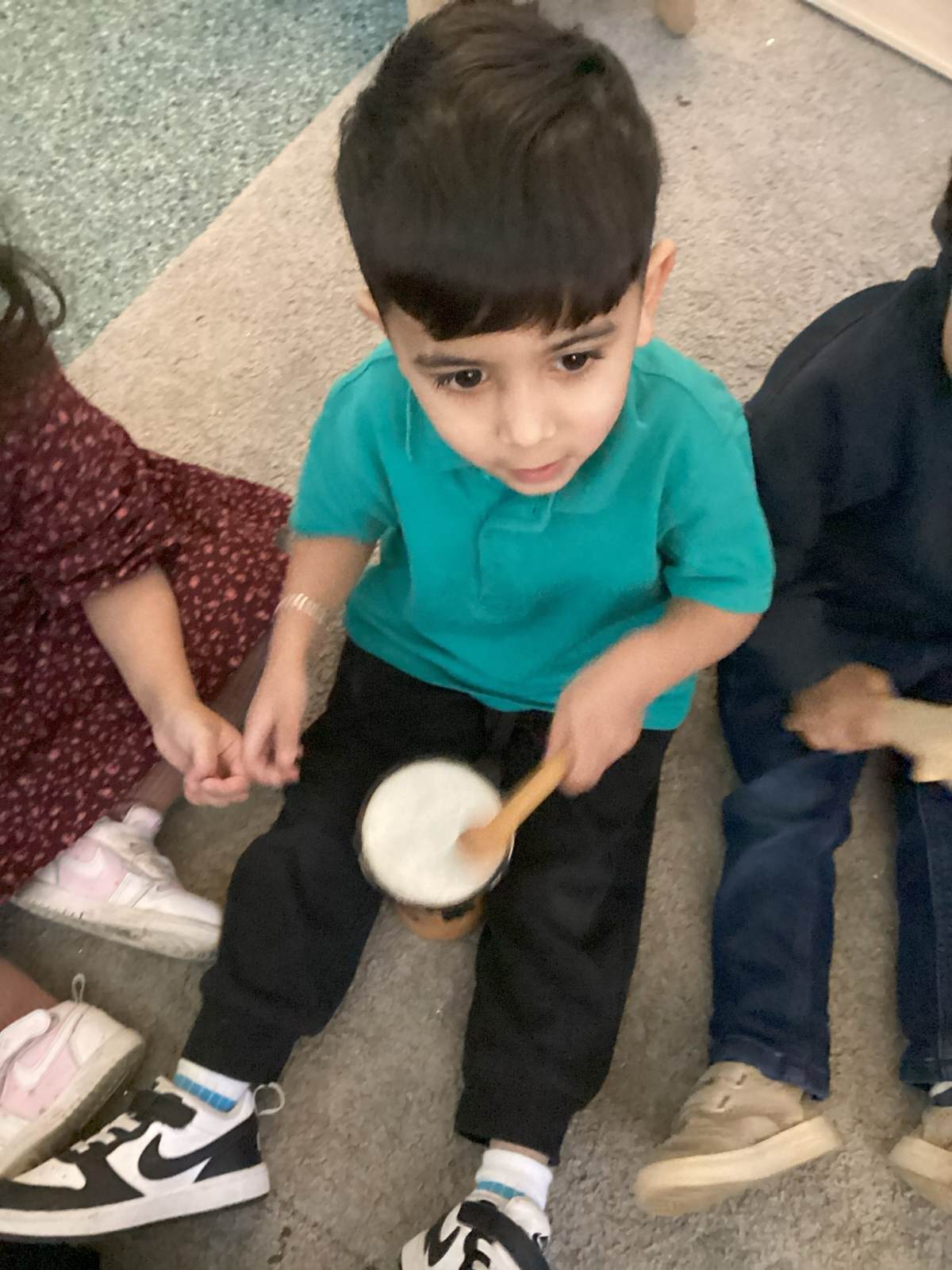 Music plays a vital role in our two-year-old provision, supporting children's communication, language development, emotional wellbeing and sense of belonging. Through singing, movement, rhythm and exploration of instruments children develop listening skills, coordination, confidence and creativity in a joyful and meaningful way.
