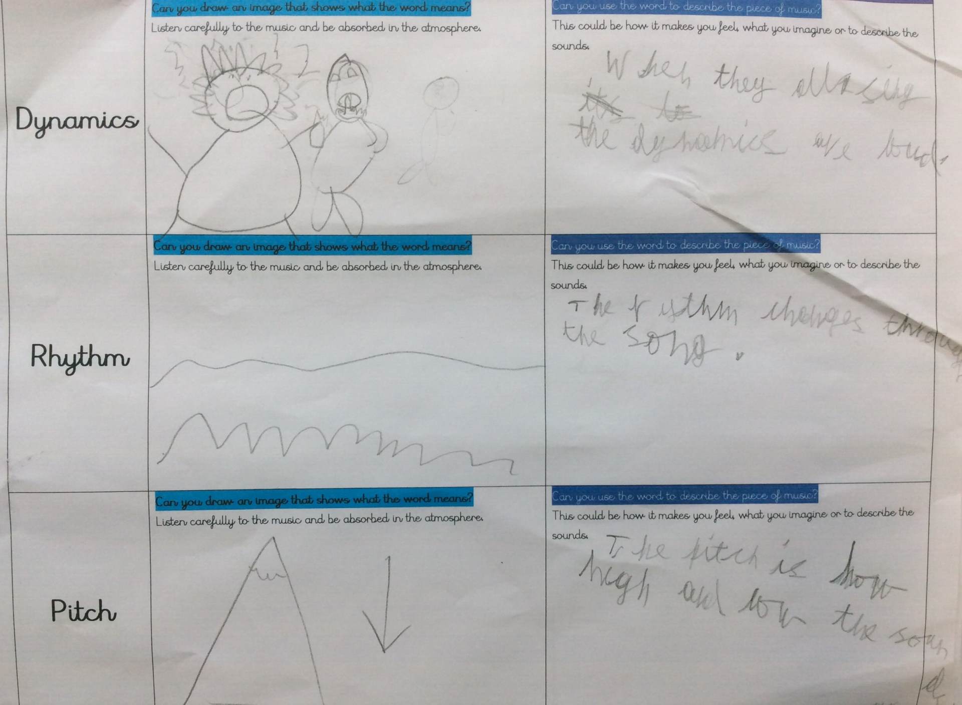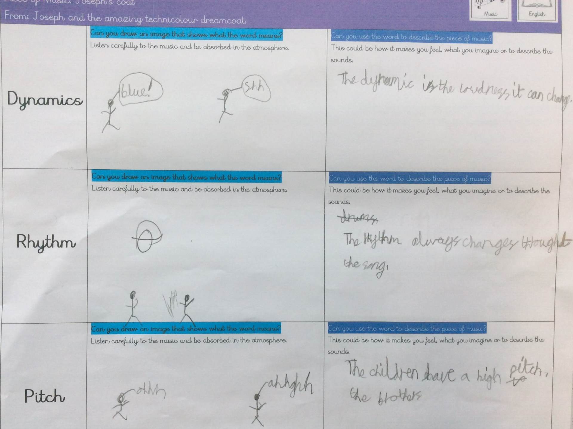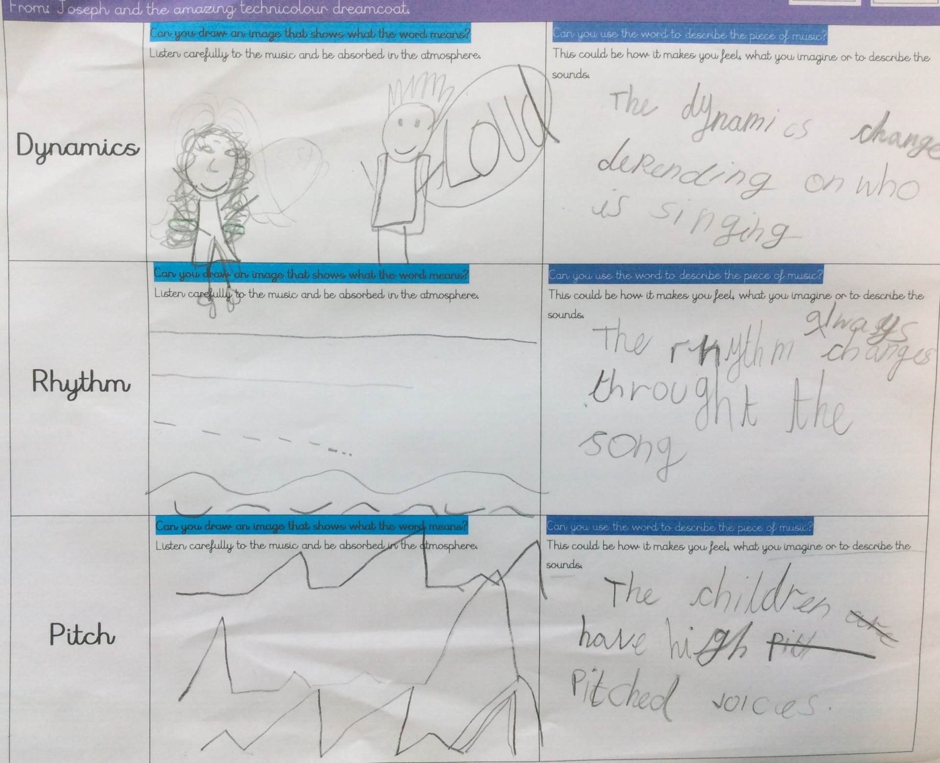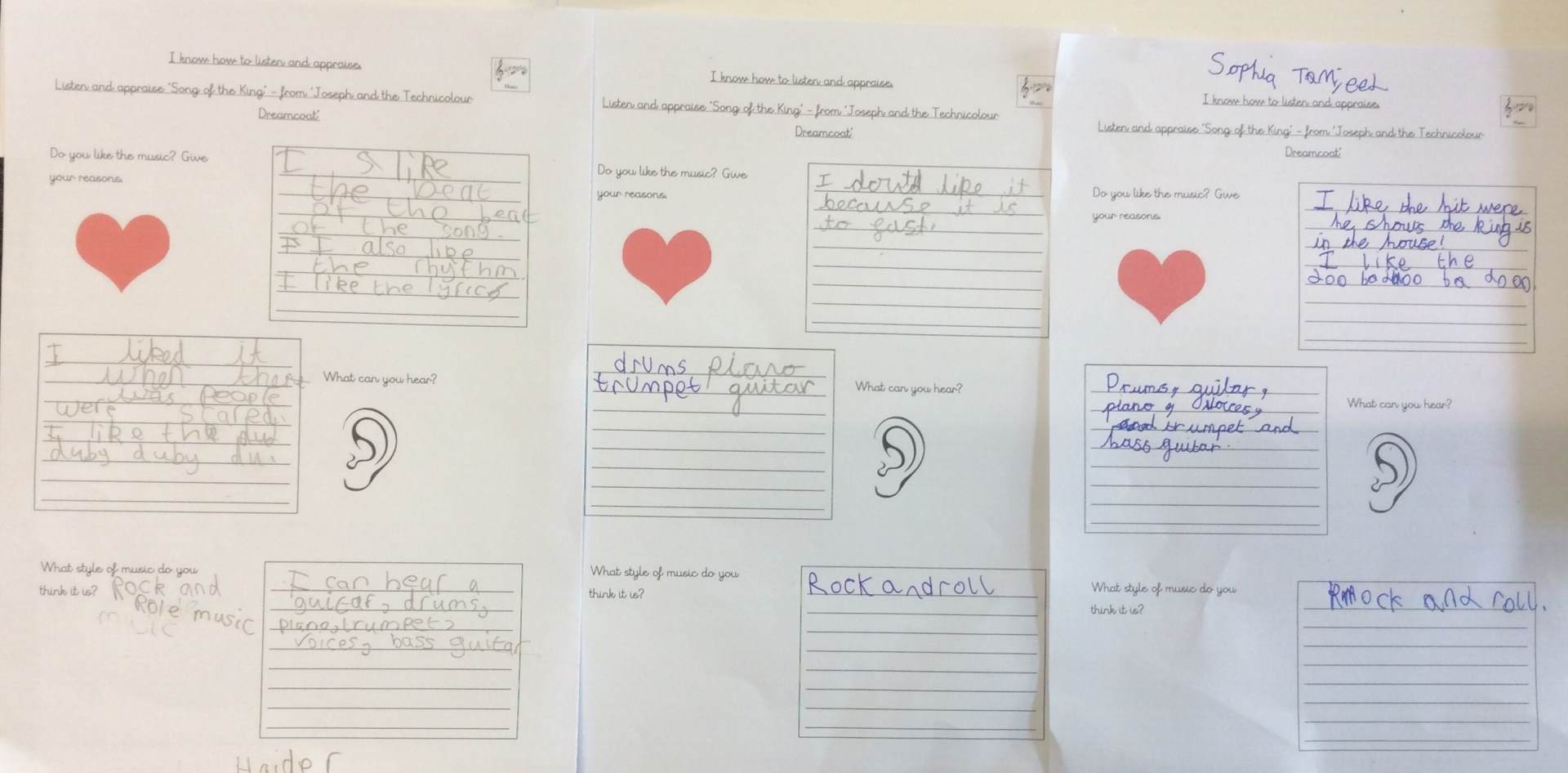 We then listened to ‘The Song of the King’ from the musical ‘Joseph and The Amazing Technicolor Dreamcoat’. We appraise it by thinking about what we liked or disliked. We also made a list of the instruments we could hear and the style of music.