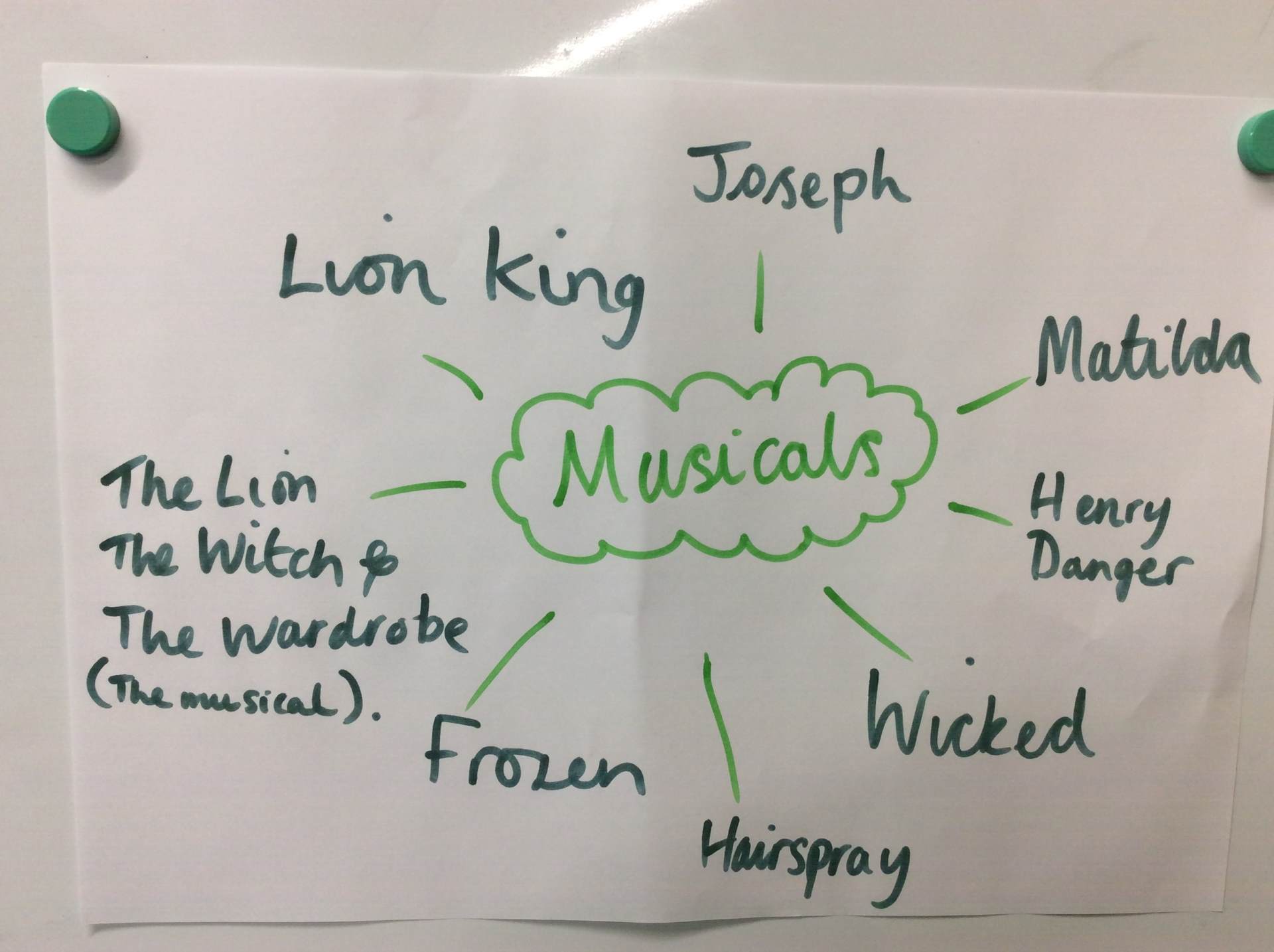 To start our lesson, we kept our knowledge of musical theatre spinning by listing all of the musical theatres we know or could remember from last week’s lesson. Here are the musicals we thought of: