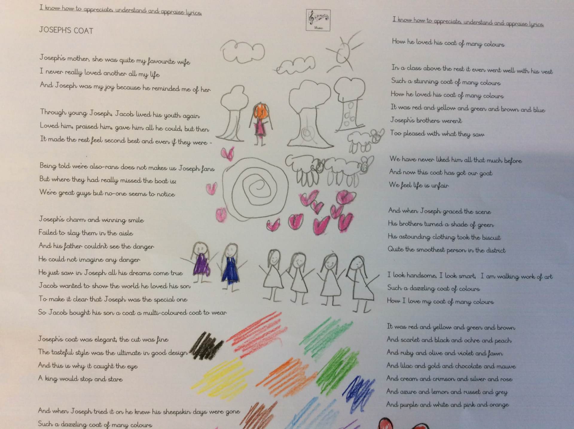 Next, we listened to the song ‘Joseph’s coat’. As we listened, we closed our eyes and let our imaginations take us on a journey. We listened again and drew pictures to express what the lyrics reminded us of.
