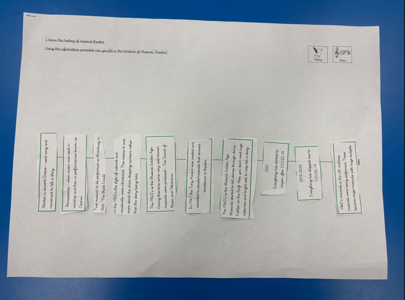 Then we watched a video about the history of musical theatre. We used a timeline to order significant events around musical theatre and this helped us to understand what it was and where it came from.