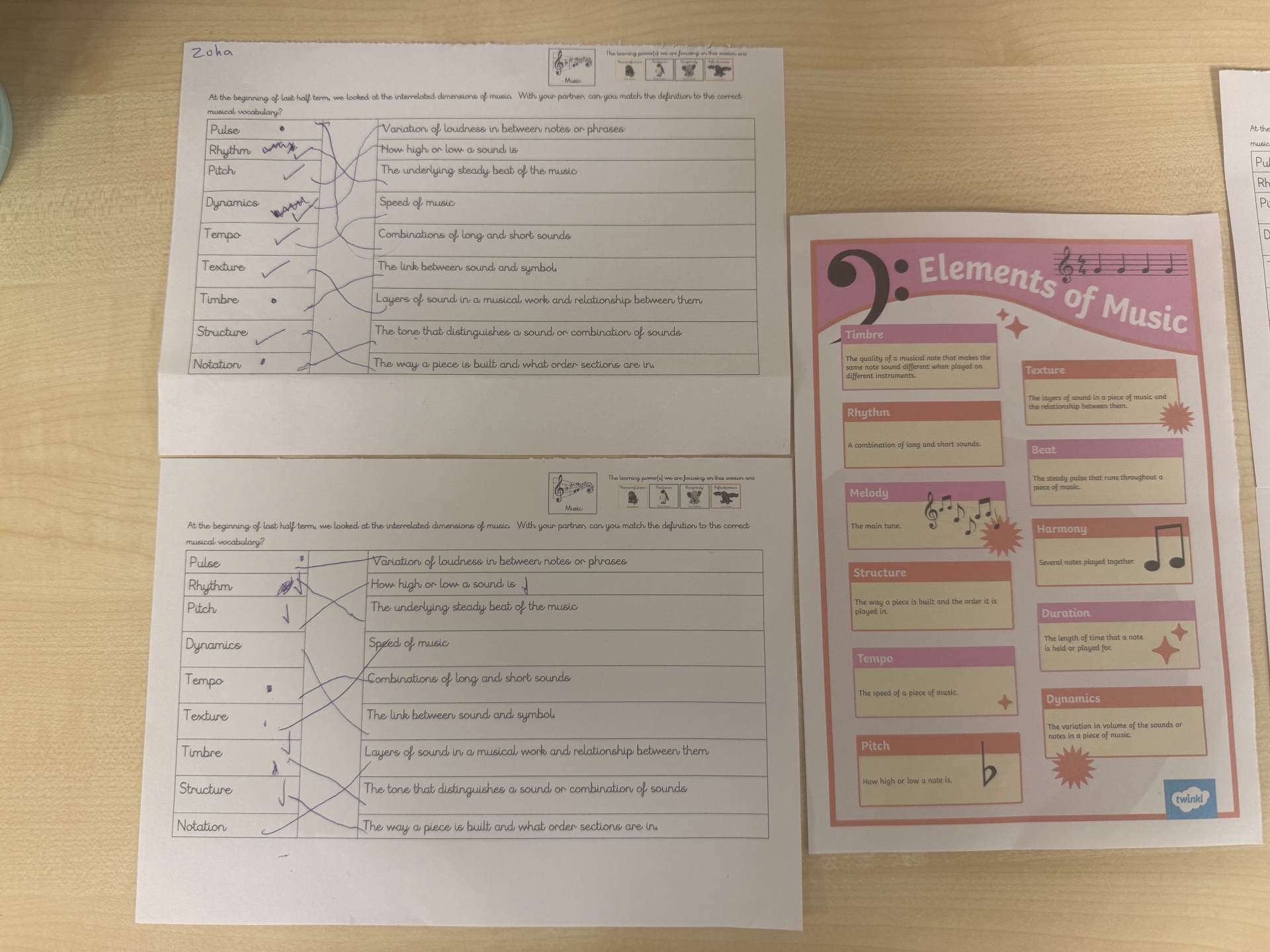 We initially used our knowledge from previous year groups to try and match each element of music to the correct definition. Some of us found it very tricky to match the two, whilst others could use the definitions and their musical inference skills to make some correct matches!