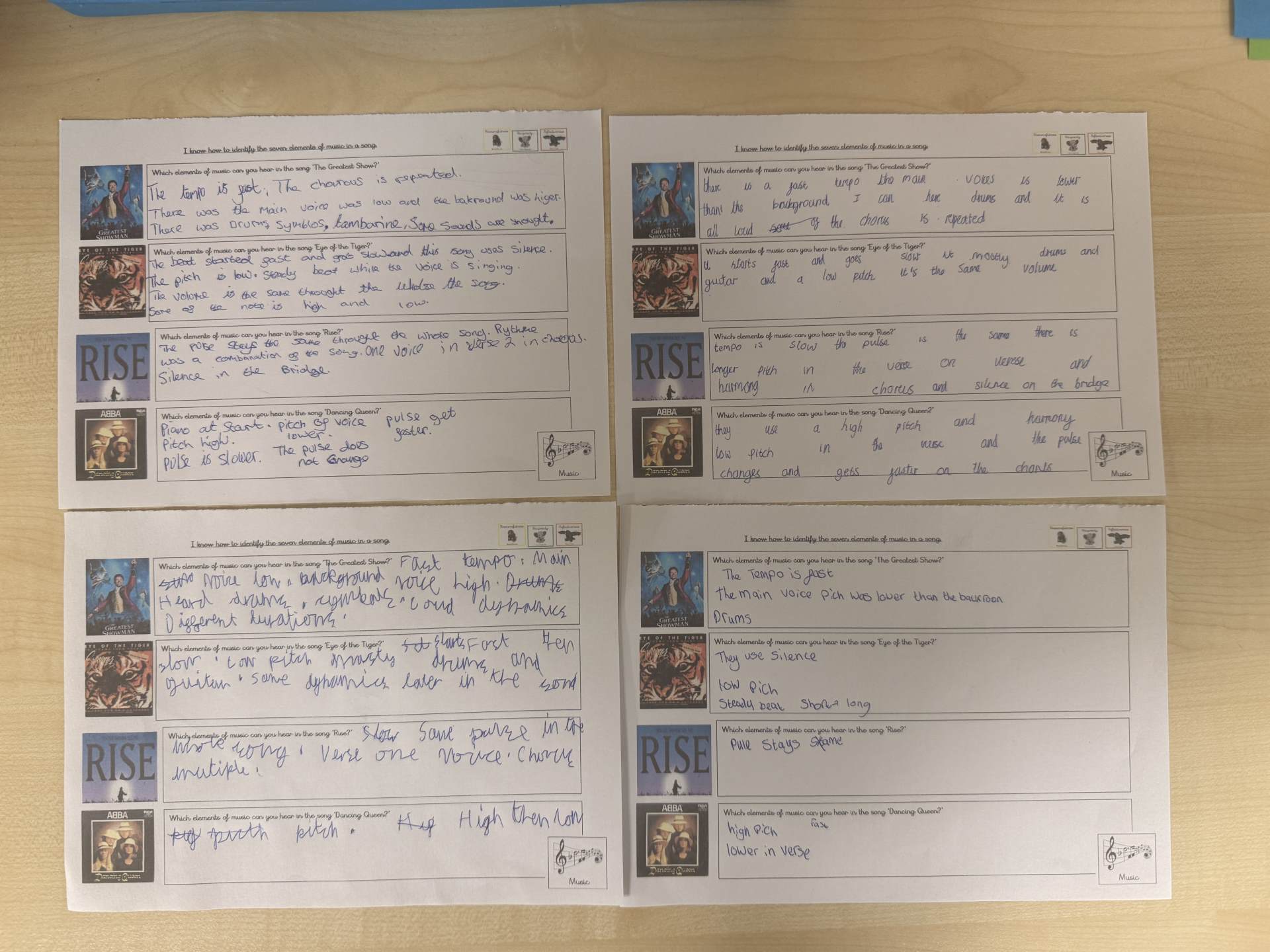 Once we had tried to use our memory, we dug deeper into the definitions of each musical term and listened to a range of music we are super familiar with (including one of the songs from our end of Year 6 show!) We used the language associated with elements of music to describe key parts of each song.