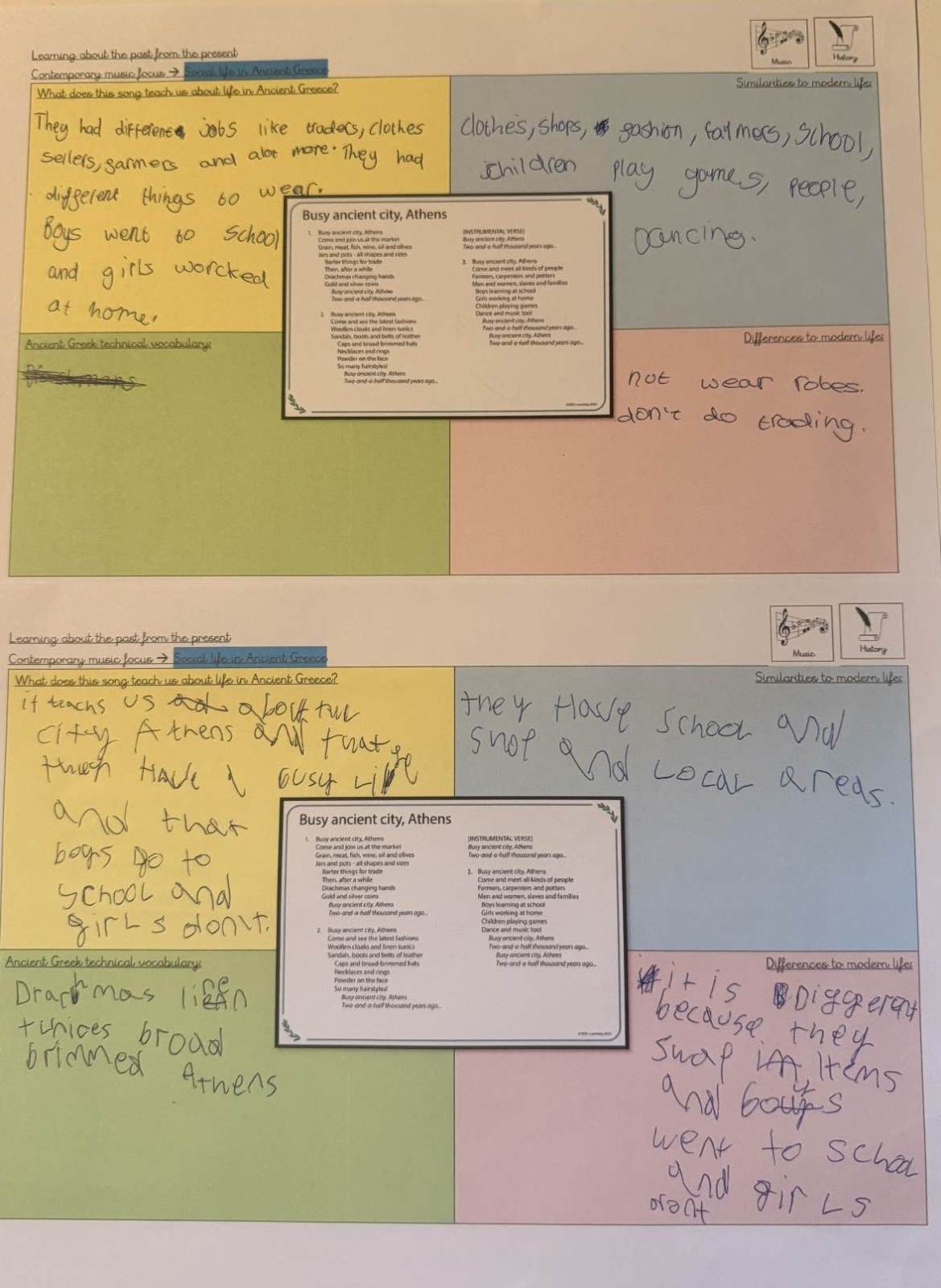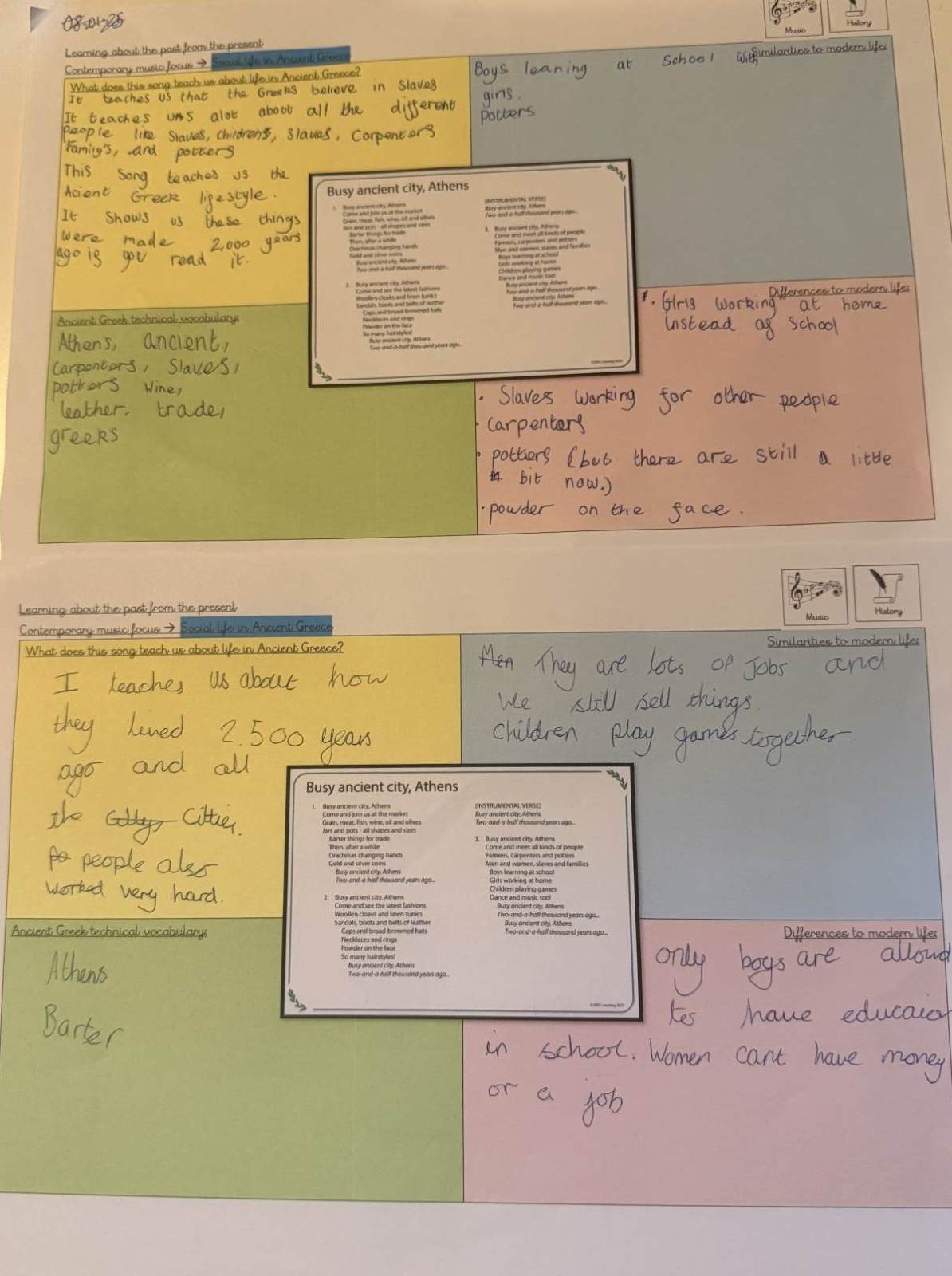 During our first lesson, we learnt about life in ancient Greece through the song 'Busy ancient city, Athens'. We listened to the song and looked at ancient Greek instruments - guessing which ones could have been used. We also discussed any new vocabulary we learnt from the lyrics.