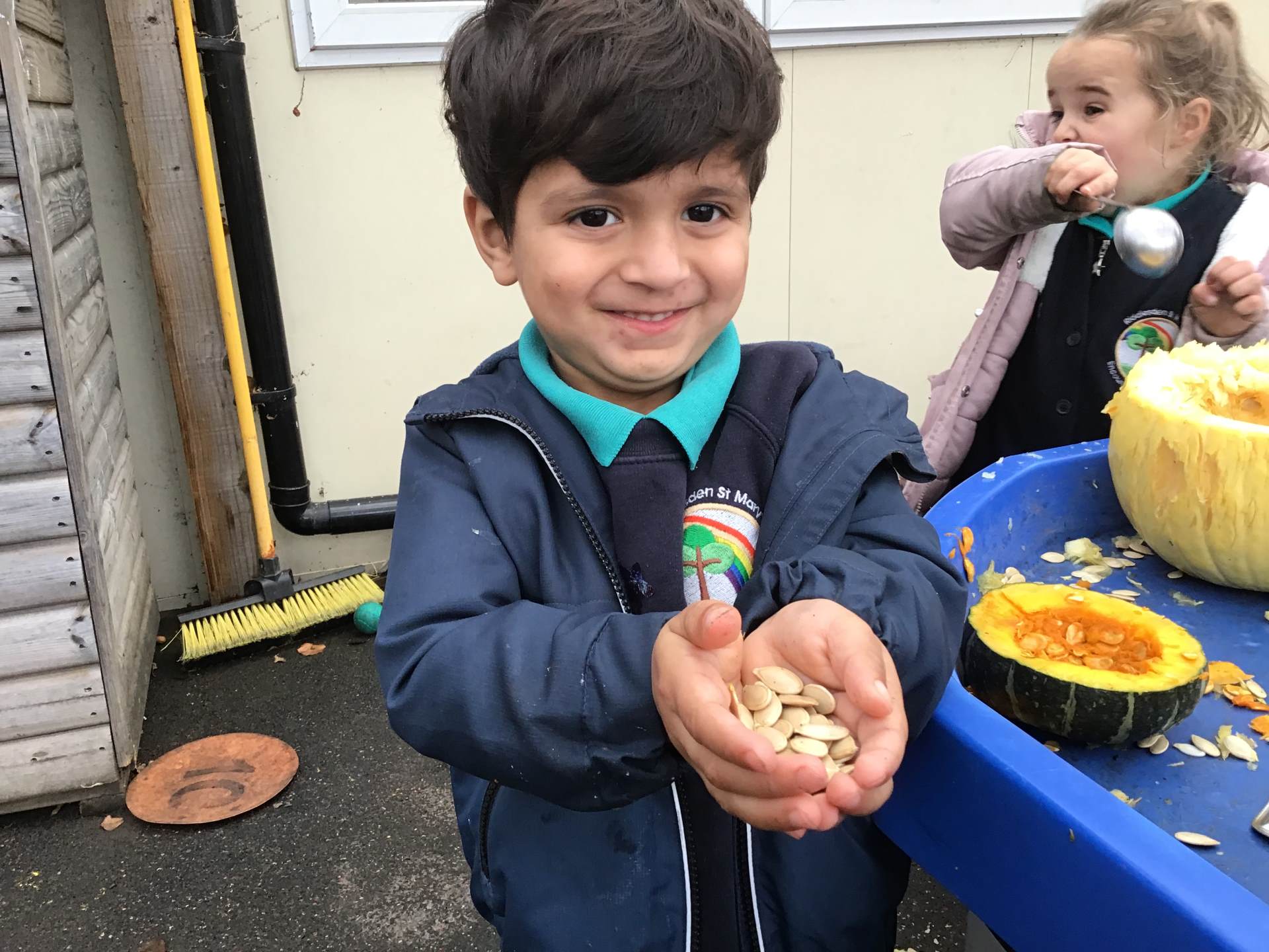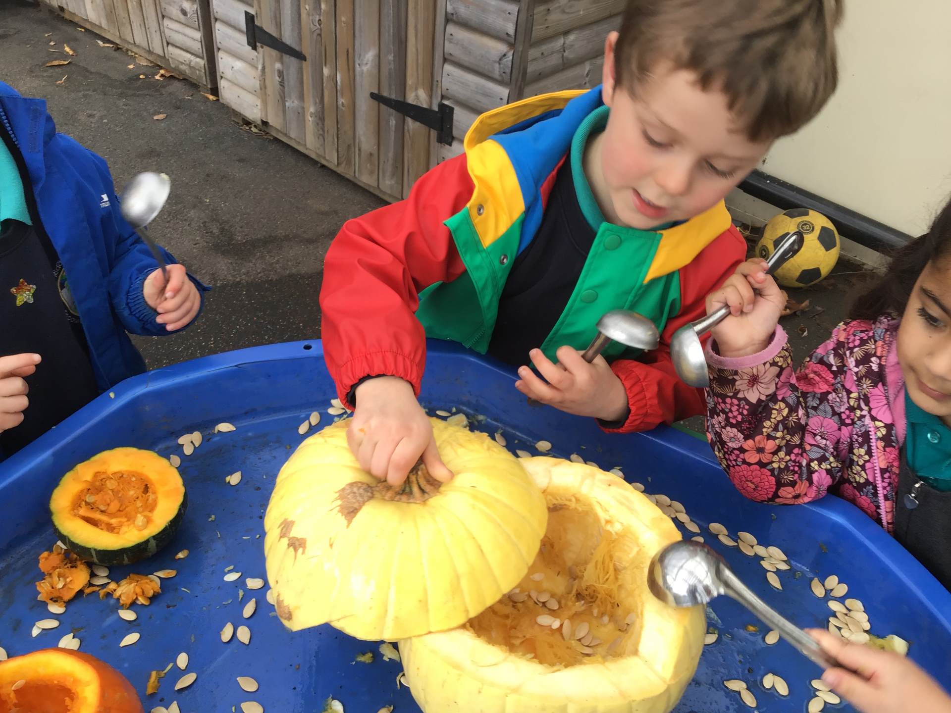 This week we have also been discovering what is inside a pumpkin, opening the ones we had in the classroom and using a range of tools to dig them out and explore.