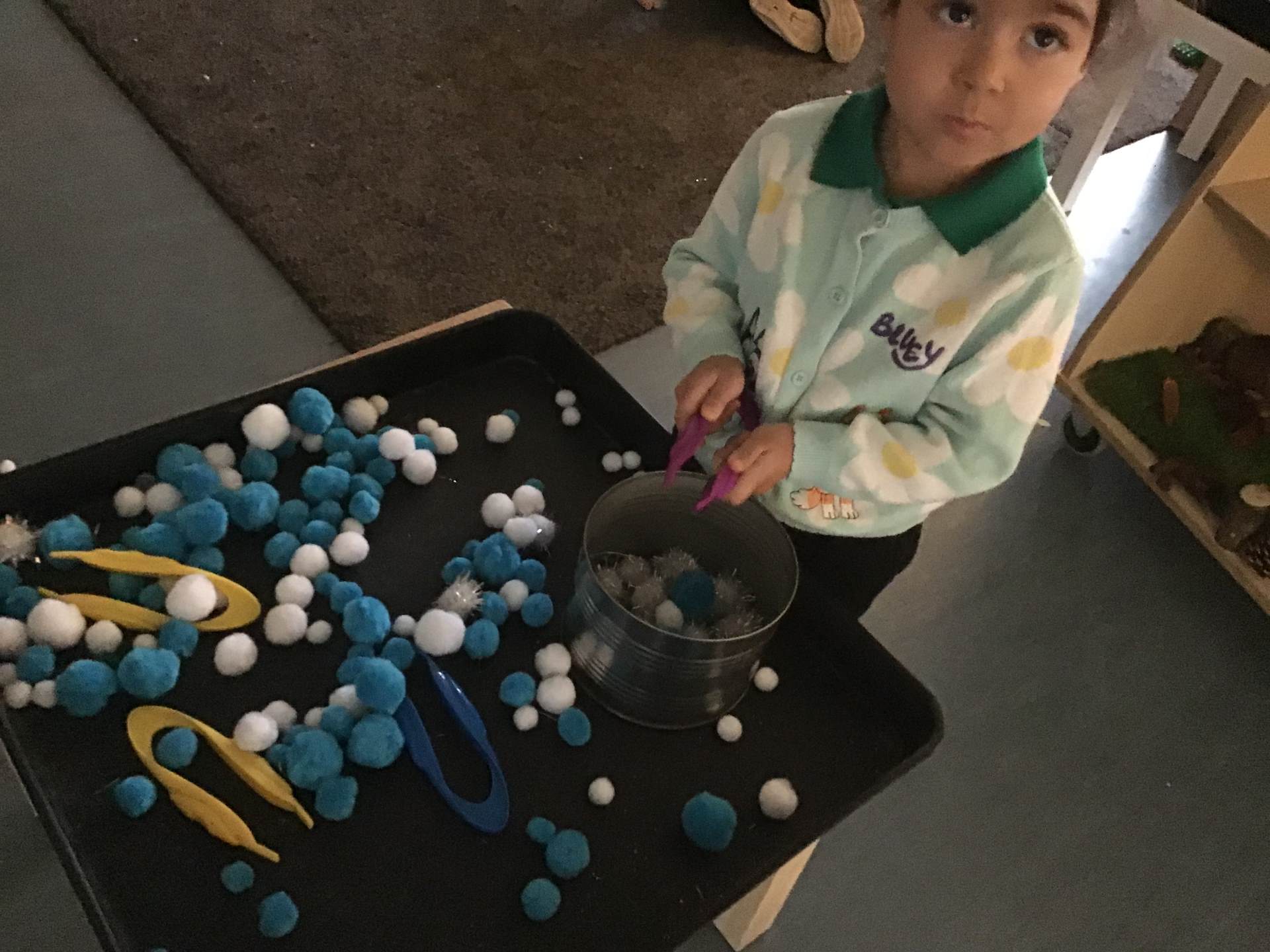 We have used our fine motor skills in a fun tweezer and pompom activity, Collecting snowballs and filling up the tin. The children have enjoyed competing against each other in this.