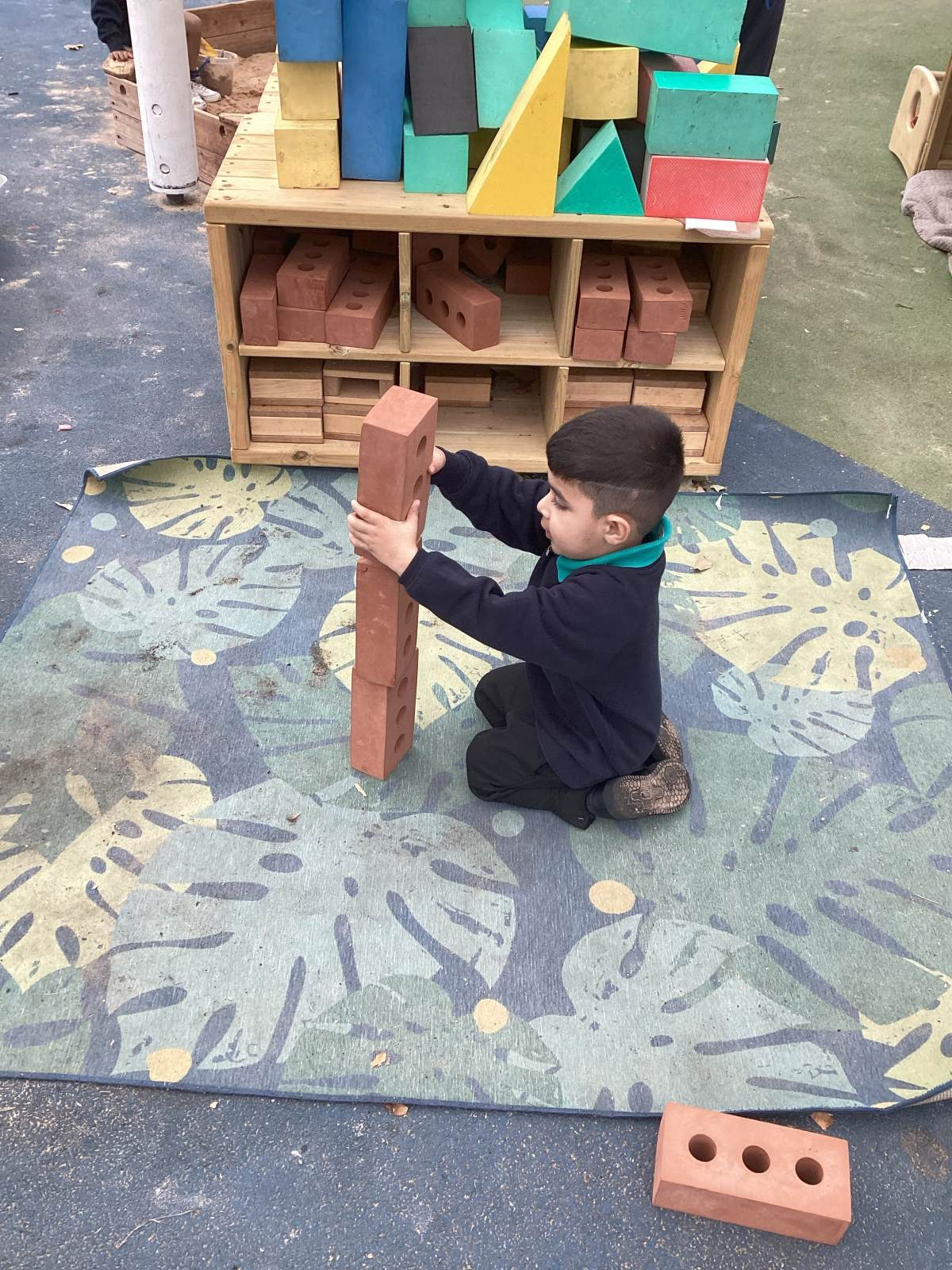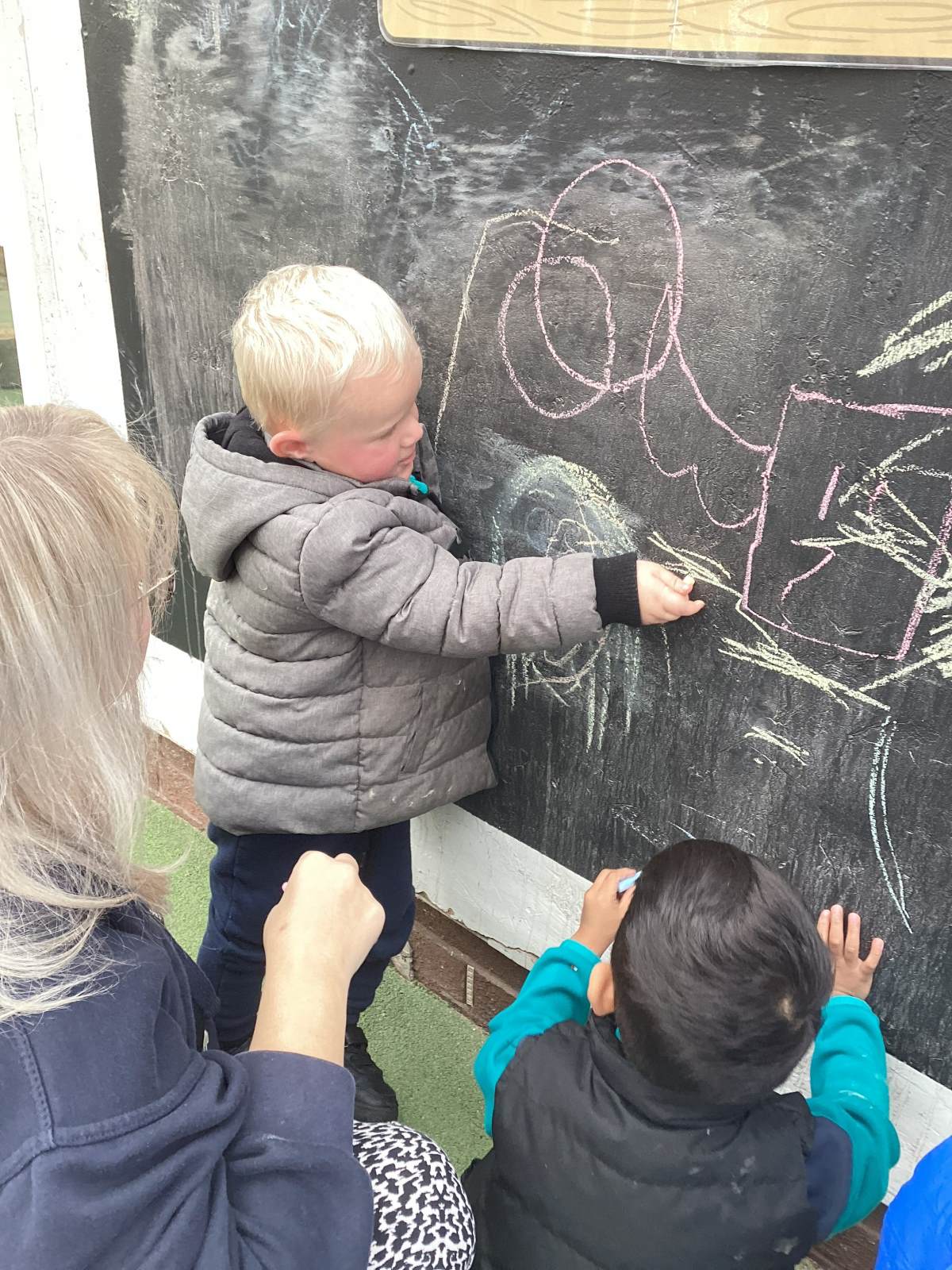 We love to use the outdoor construction area to stack to blocks. We love to play in the sandpit outside, creating sandcastles, scooping, filling and emptying the sand from buckets. We use the large chalk board to develop our Fine Motor Skills, creating both large and small marks!