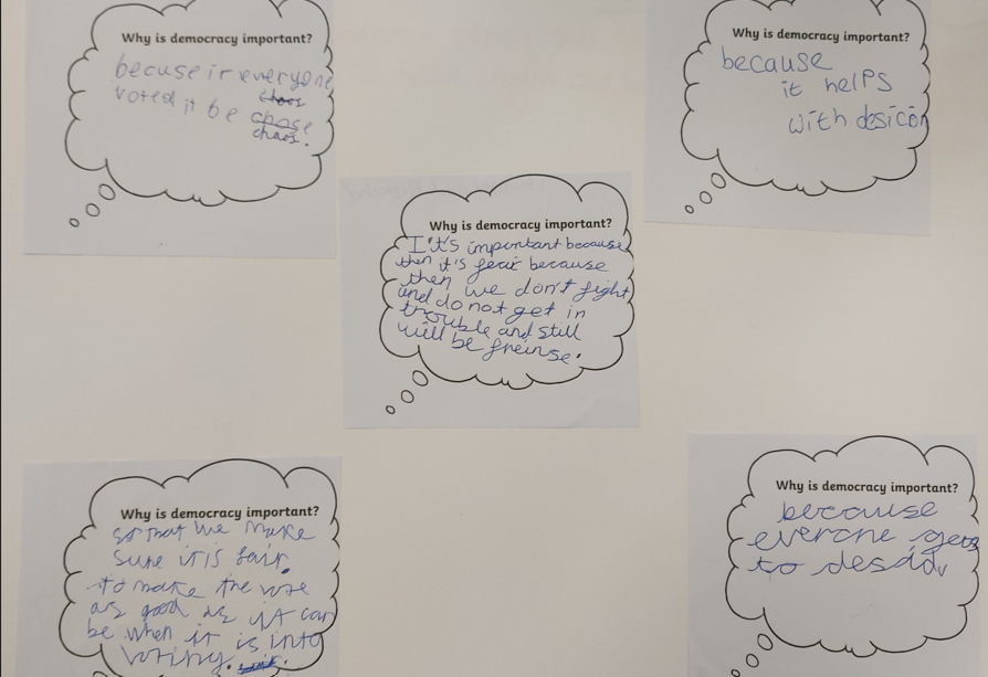 As a class we reflected on our democratic rights and why it is so important to allow people to vote for changes or choices that matter to us. We had a class vote to decide which of our worship songs we were going to sing. Although not everyone got their favourite choice, we agreed that it was fair as the majority of the class were happy with the song choice. We then wrote down our thoughts as to why democracy is so important.