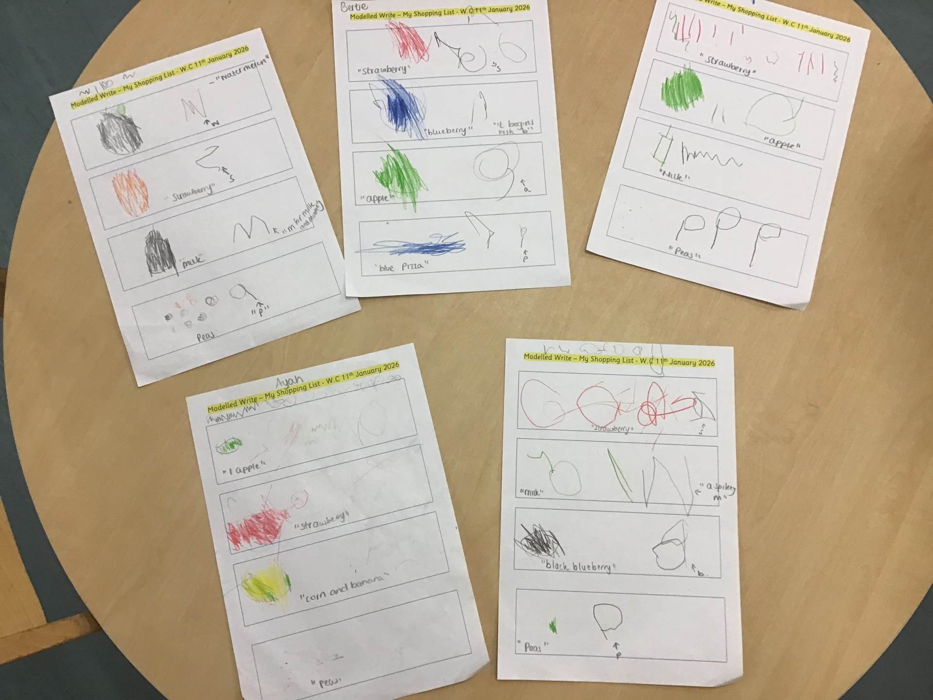 In topic this week our caterpillar sent another note explaining that he was hungry and needed some more food. He asked us to write some shopping lists which we did together as a modelled write but then we set up our own list writing station which the children have loved. We have seen some lovely mark making.