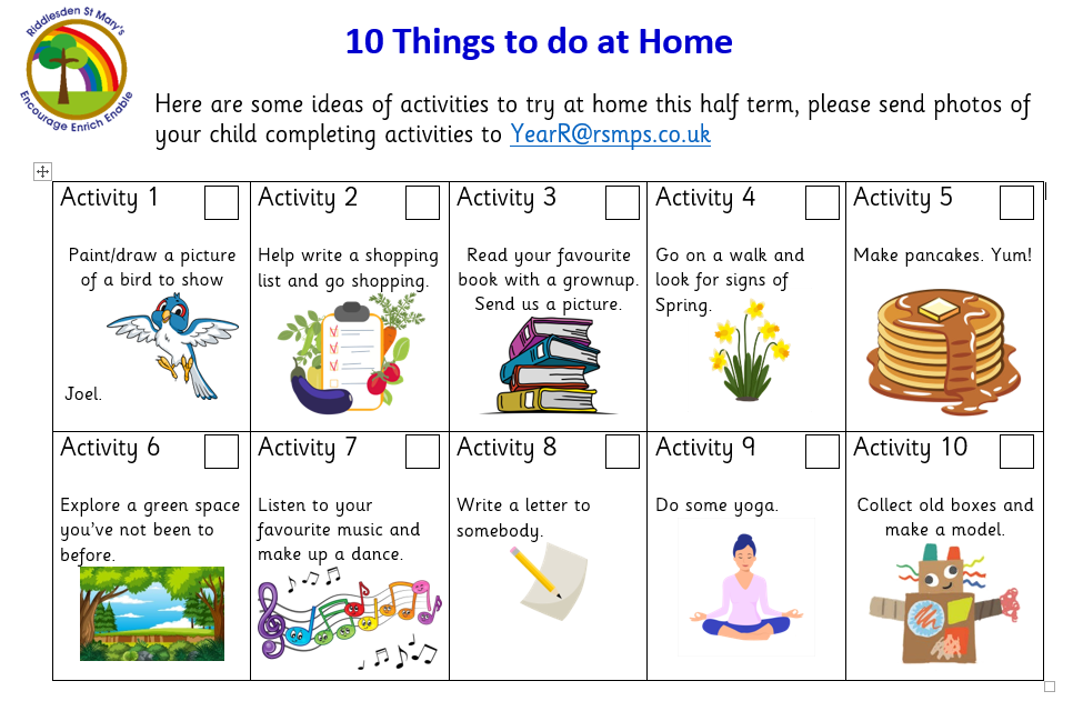 Below you will find our Spring 1 curriculum overview as well as '10 Things to do at home.'