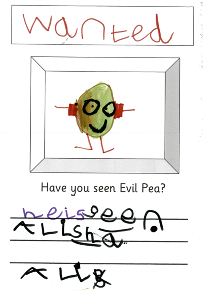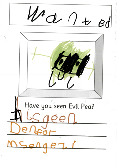 The evil pea was up to his old tricks again and trying to cause mayhem in Nursery this time. We needed to warn them so we created wanted posters so Nursery could keep a look out for the Evil Pea.