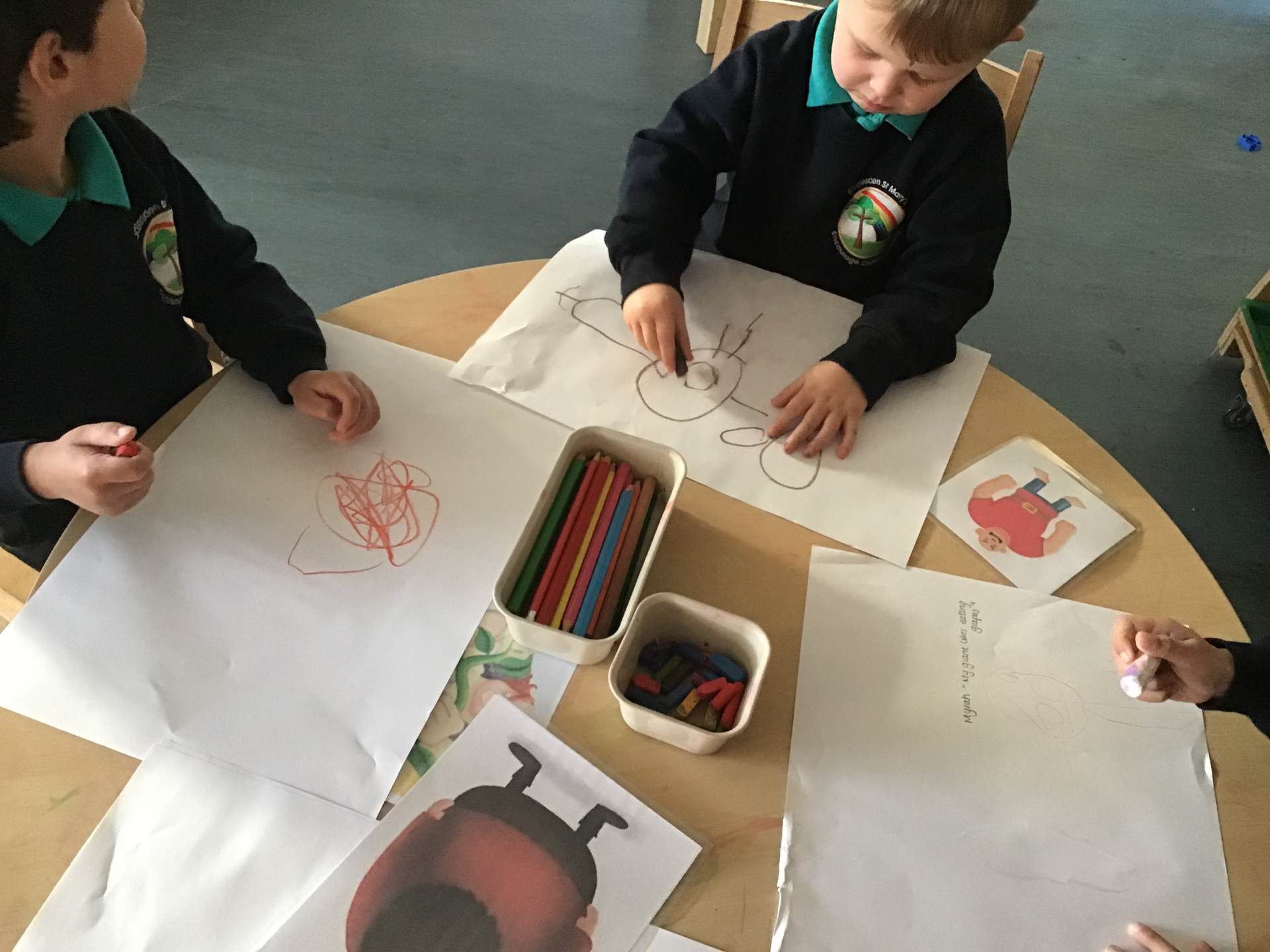 We also enjoyed doing some observational drawing of giants, we used picture prompts and our own ideas about what giants look like. The children are really noticing details and putting more detailed ideas into their pictures. Take a look at some of our amazing pictures.