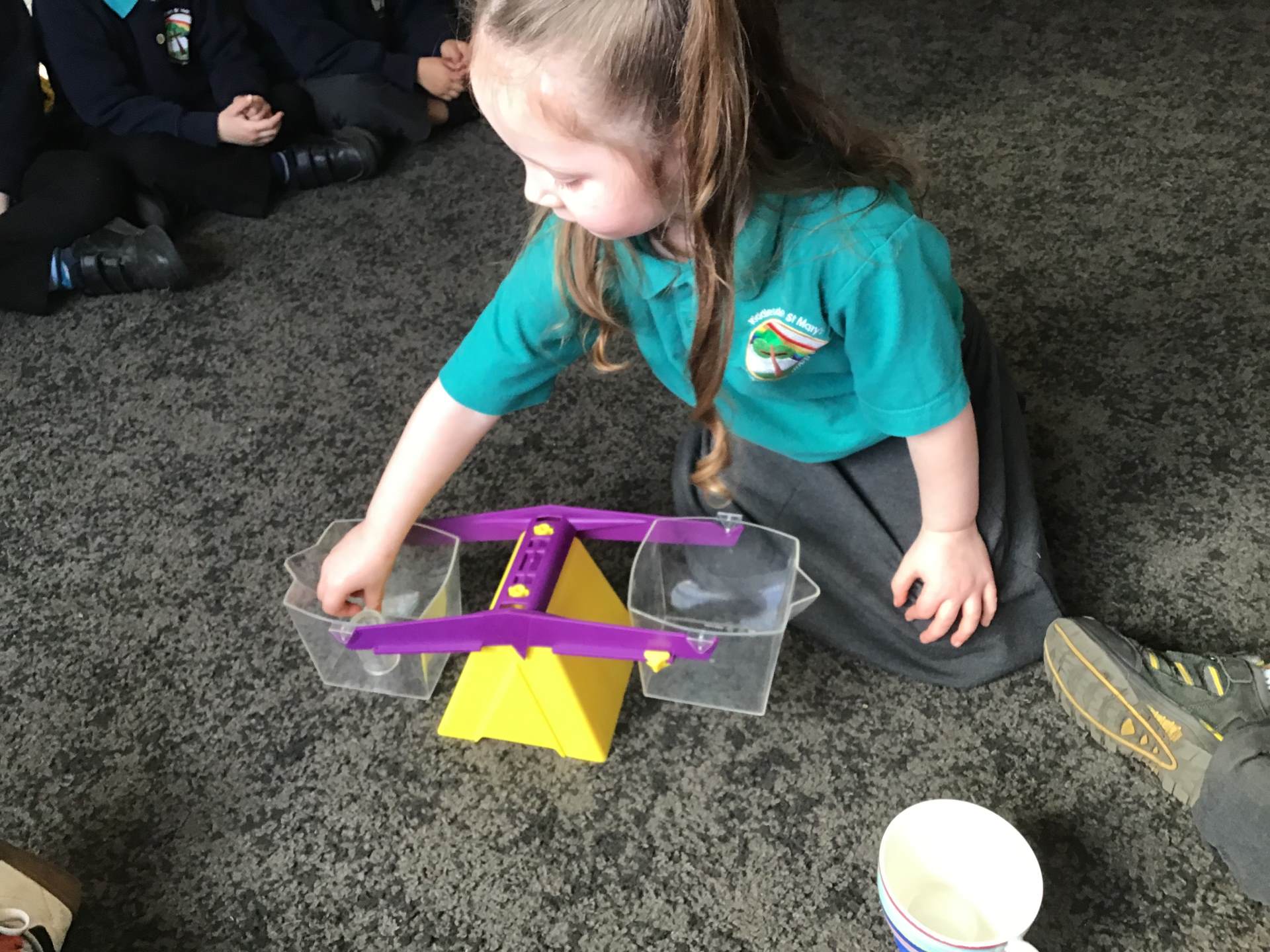 In maths this week we explored mass and size, particuarly looking at the terms heavy and light. The giant sent us a giant sized tin of beans to show us how they compared to the beans we buy in the supermarket. We also looked at how to use weighing scales, comparing objects. We introduced the terms heavy, light and balanced.