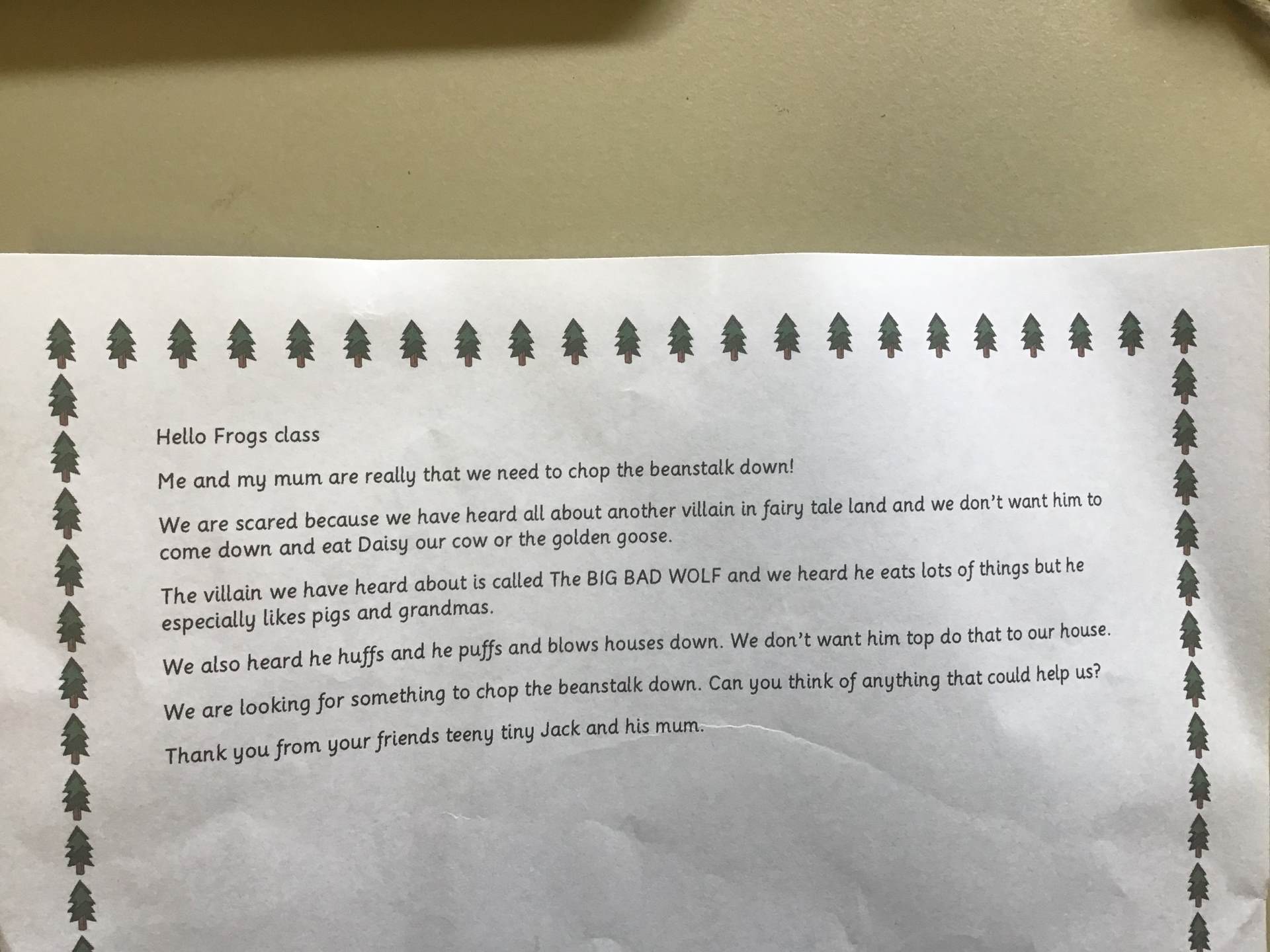 The next day Jack sent a letter to tell us he needed to chop it down. He asked the children what he would use to chop it down and they came up with their ideas.