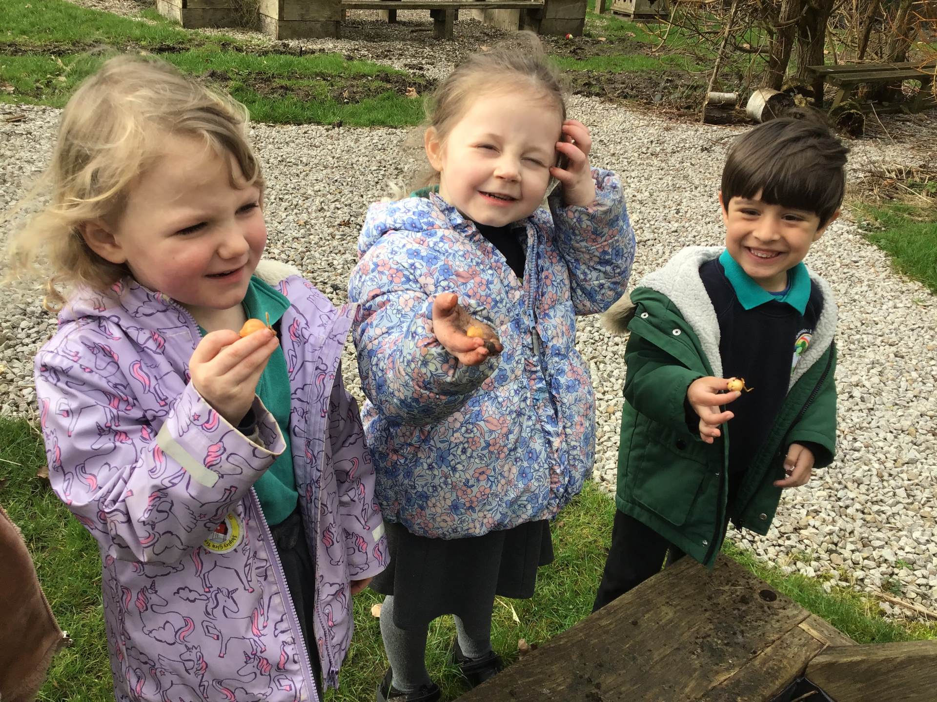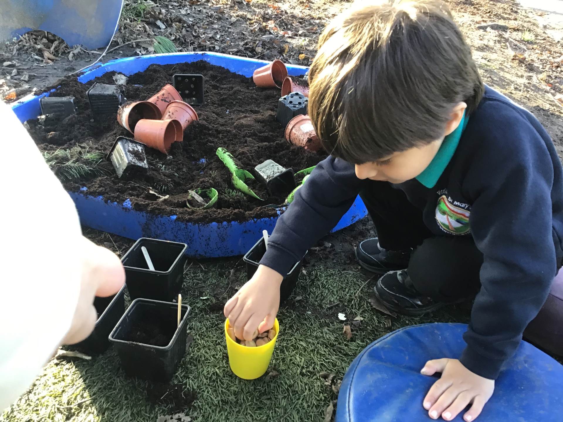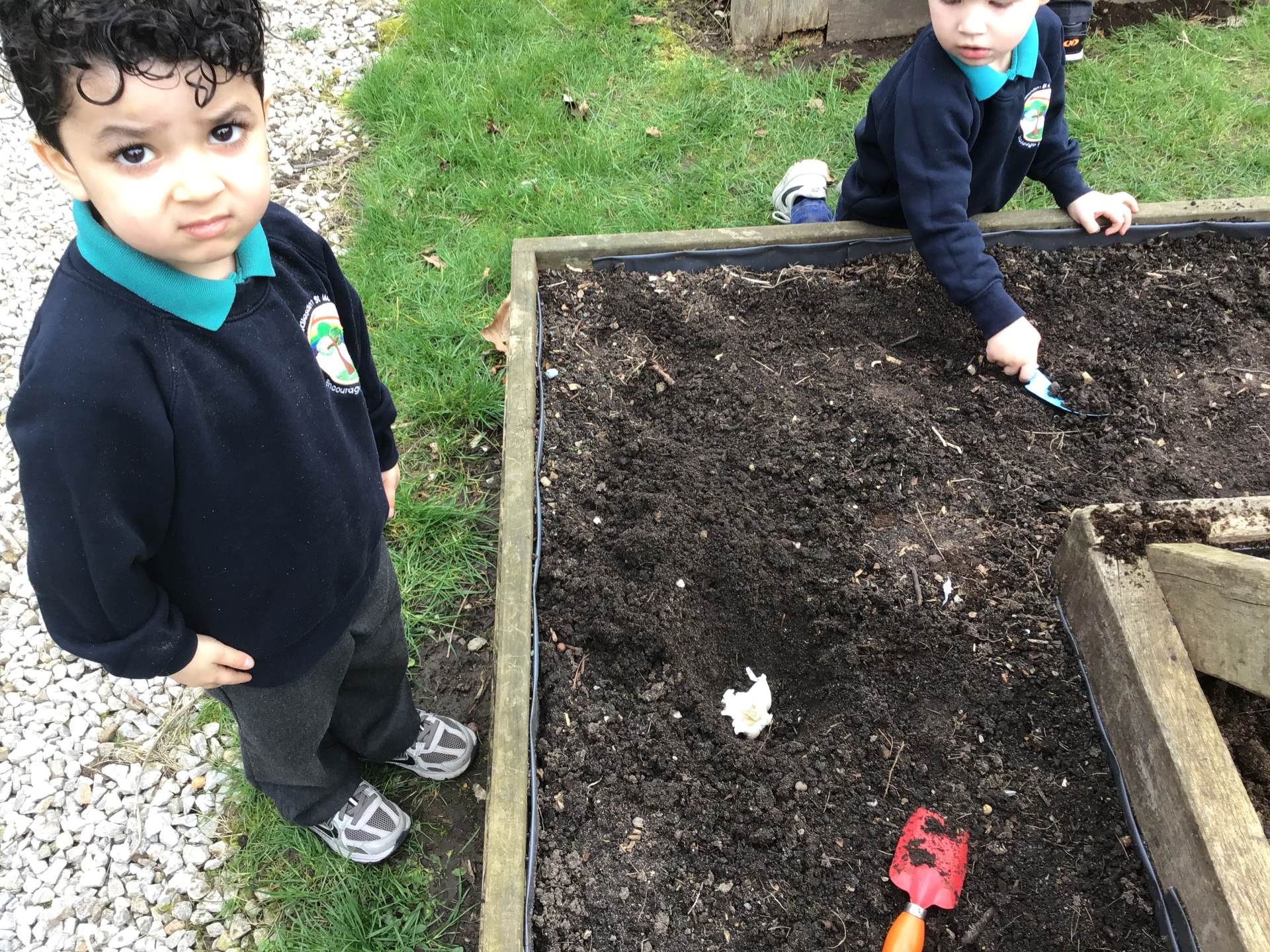 We had a letter from the top of the beanstalk from the giant explaining that fairytale land had run out of onions and garlic and could we plant some in the edible garden in school, this has helped us to begin learning about how plants grow and what they need to make sure they grow well.