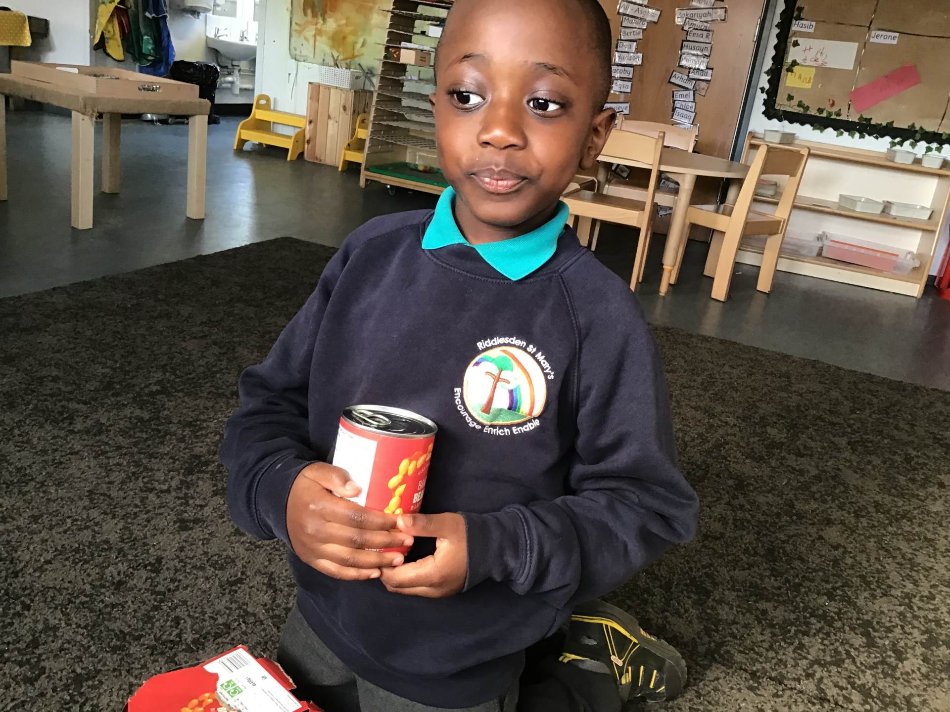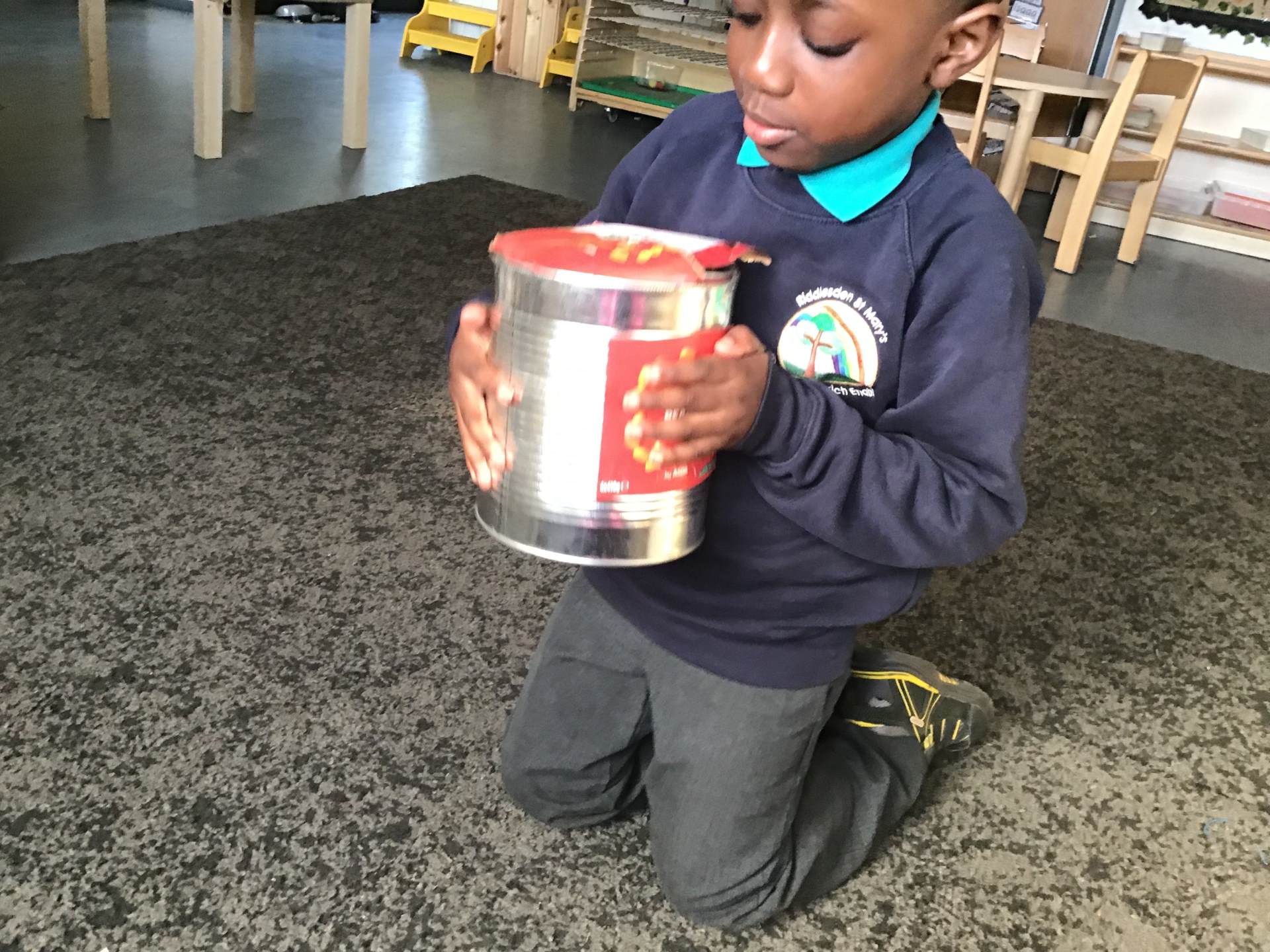 In maths this week we explored mass and size, particuarly looking at the terms heavy and light. The giant sent us a giant sized tin of beans to show us how they compared to the beans we buy in the supermarket. We also looked at how to use weighing scales, comparing objects. We introduced the terms heavy, light and balanced.